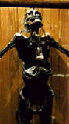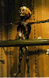 Hanging from the wall on wires are three eviscerated humans, two children and an adult. These are medical specimens. Their chest and bellies have been cut open and the skin pinned back so the external organs are visible. They are very dried out. I imagine that they'd be really light if you wanted to carry one around. (What a great idea! That could be the next big thing! Just like the pet rock! It'll make millions!)